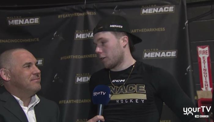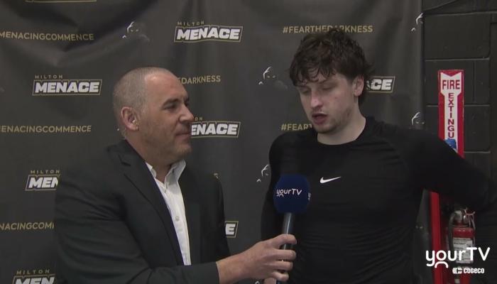 Alan Corkum interviews Milton Menace Goaltender Austin McKillop following their 3-1 victory over the Burlington Cougars in Game 7 of the first round. Hear McKillop's thoughts after shutting down the Cougars to secure the series win.