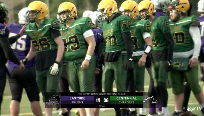The Centennial Chargers came away with the victory in the Senior Bay of Quinte Championship games played at Mary-Anne Sills Park in Belleville, Ontario. #Football #BayofQuinte #BOQ #Quinte #Finals #HighSchool #Centennial #CentennialChargers #Eastside #EastsideRavens #Belleville