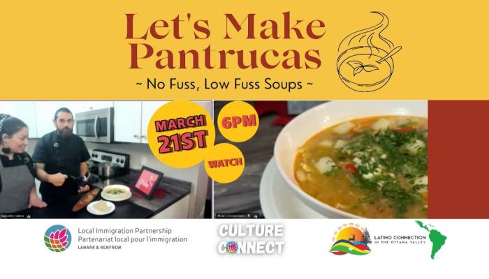 Join Tonka and Alvaro in their kitchen for a "Low Fuss, No Fuss Soups" Chilean cooking class, a flavourful event hosted by Culture Connect and the Local Immigration Partnership.