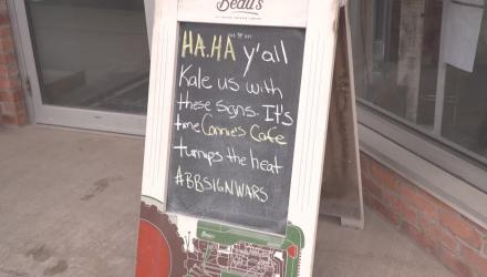 Video Link May 5, 2021 Bracebridge businesses are having fun with the 'sign war' challenge You may have noticed some interesting signs popping up in and around stores across Muskoka.